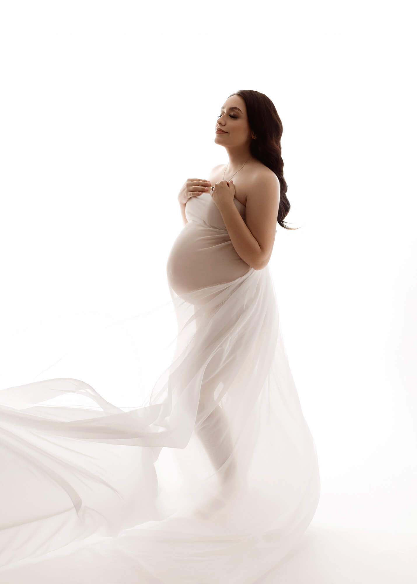 Maternity session in Fresno studio with mom wearing elegant white silk drapery by Roxy G Photography.